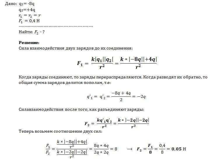 Два заряда -8 q и +4q взаимодействуют в вакууме с силой 0,4H. Заряды соединили и развели на прежнее расстояние.Определите силу взаимодействия после этого только не просто ответы, а поподробней напишите формулу, что и как считали, и подставляли.