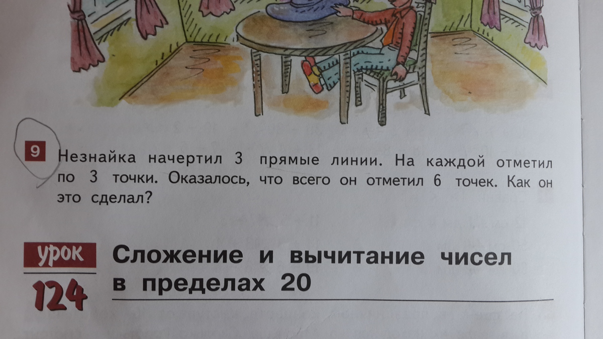 Все просто. Незнайка начертил 3 линии, которые пересеклись в точках.вот и всего 6 точек)