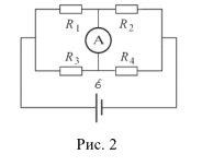 Какой ток будет идти через амперметр в схеме, изображенной на рисунке. Э.д.с. источника равна . Внутренними сопротивлениями амперметра и источ- ника пренебречь. Рассмотреть два случая: а) R1=R4=r; R2=R3=2r; б) R1=R2=R3= r, R4=2r.