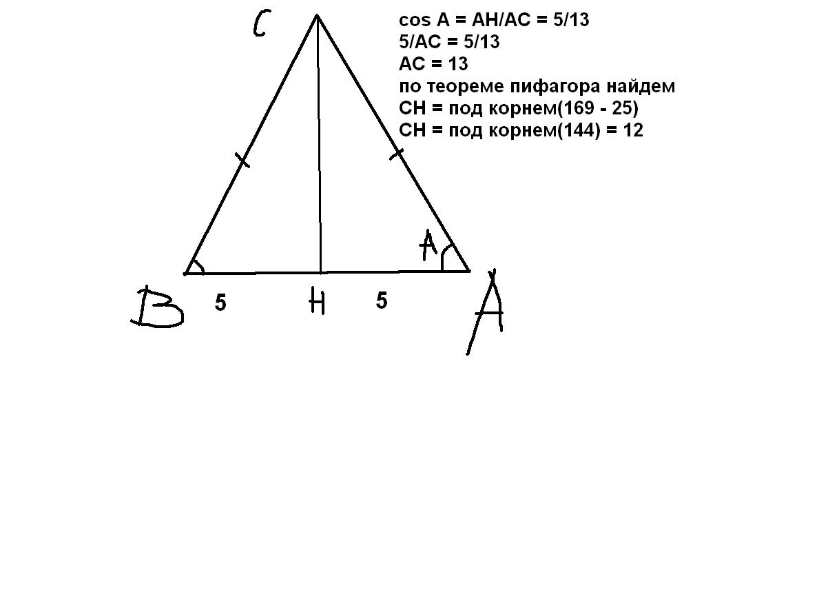 СН = АН*tg А = 5*sinА/cosA = 5*(√1-cos²A)/cosA = 5*(12/13)/(5/13)=5*12/5=12