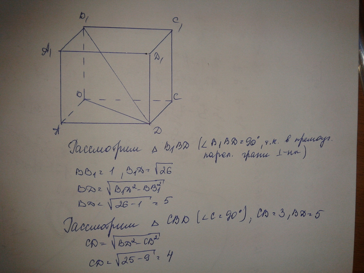 В прямоугольном параллелепипеде ABCDA1B1C1D1 известно, что DB1=корень(26), AA1=1, C1B1=3. Найдите длину ребра CD