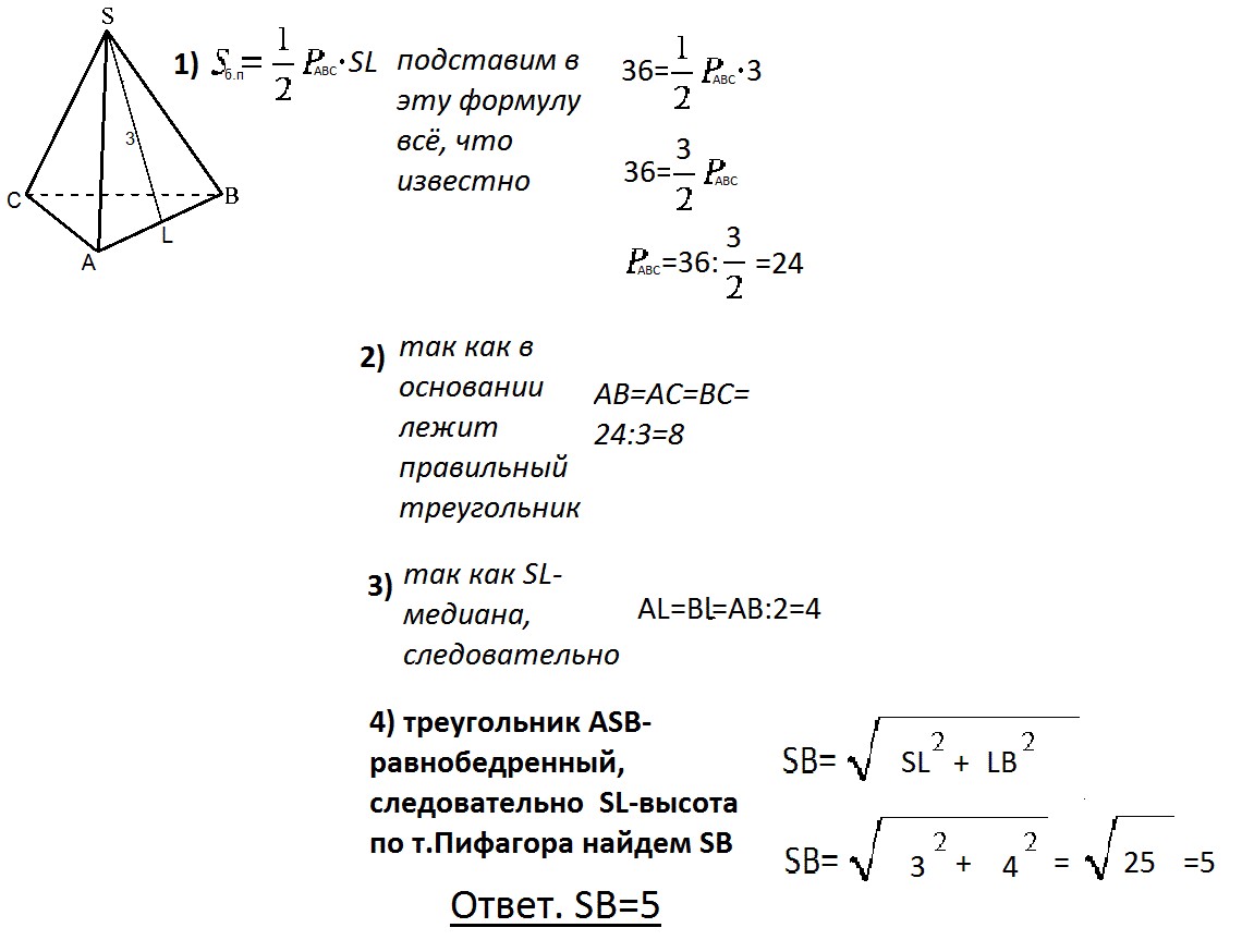 В правильной треугольной пирамиде SABC с вершиной S медиана SL треугольника SAB равна 3. Площадь всей боковой поверхности равна 36