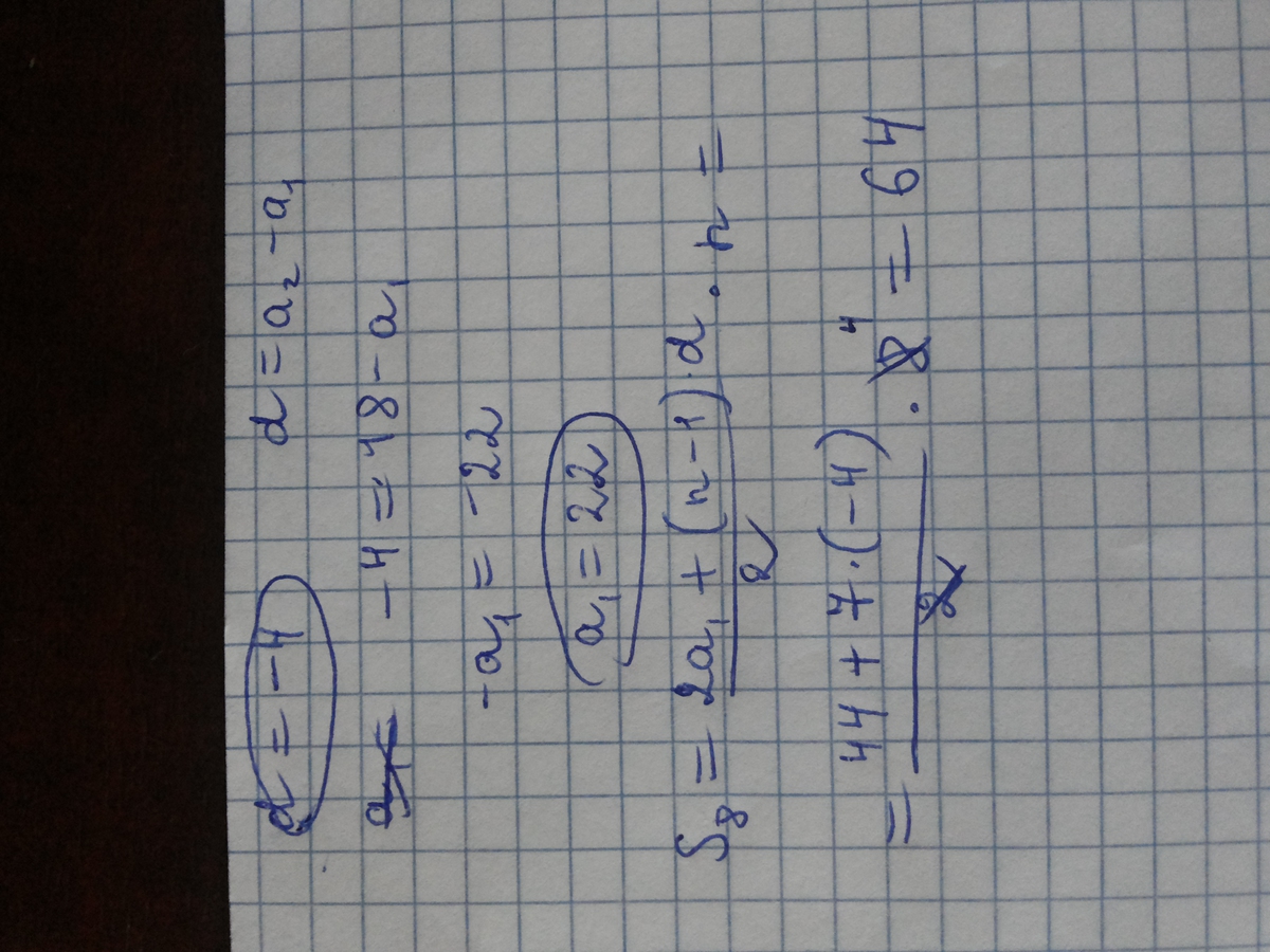 Дана арифметическая прогрессия (An) в которой а2=18,,а3=14 найдите: 1)первый член и разность прогрессии 2)сумму первых 8 членов прогрессии