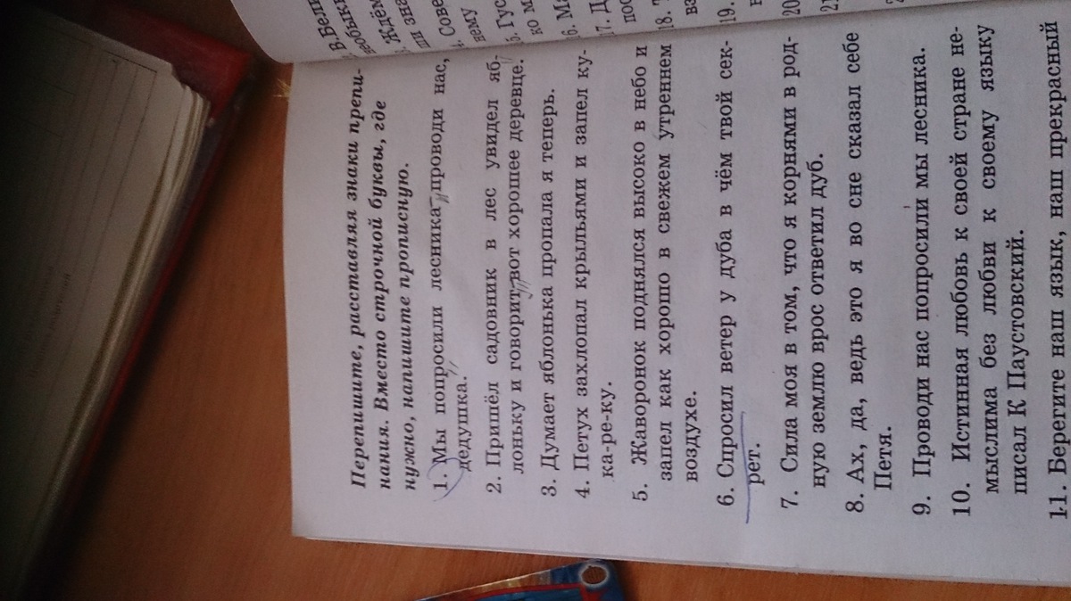 1 Мы попросили лесника;"Проводи нас,дедушка"2 Пришёл садовник в лес,увидел яблоньку и сказал:"Вот хорошее деревце" 3 Думает яблонька,"Пропала я теперь"4 Петух захлопал крыльями и запел:"Ку-ка-ре-ку!" 5 Жаворонок поднялся высоко в небо и запел:"Как хорошо в свежем,утреннем воздухе!" 6 Спросил ветер у дуба:"В чём твой секрет?"