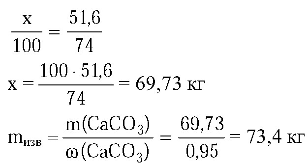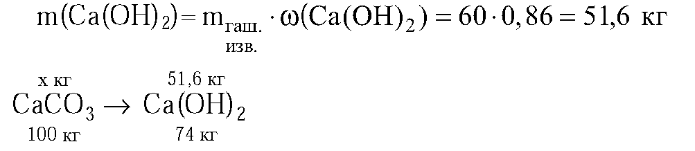 Рассчитайте массу известняка с массовой долей карбоната кальция 95%, которая израсходуется на производство гашеной извести массой 60 кг с массовой долей гидроксида кальция 86%