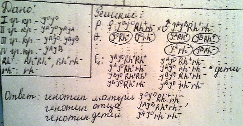 Мать имеет 1 группу крови,резус-положительную,отец- 4 группу резус-положительную. Дети имеют 2 группу, резус-отрицательную.Определить генотипы всех членов семьи.