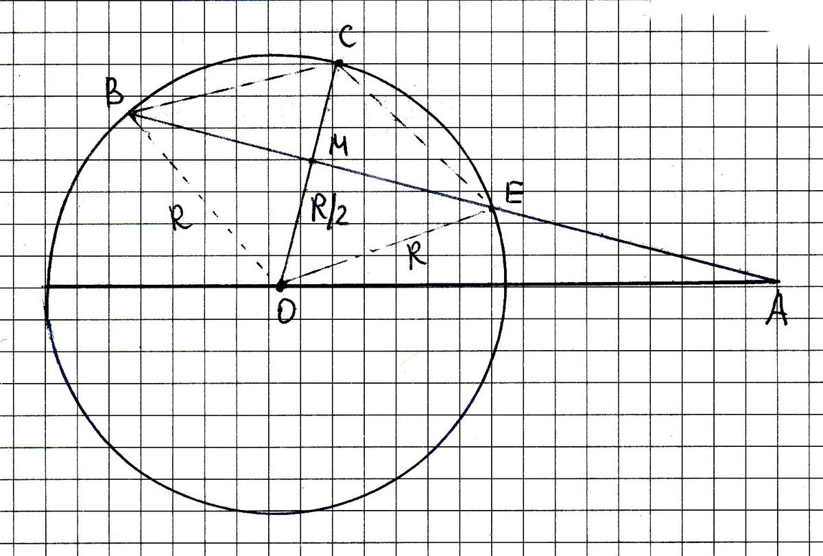 ОС перпендикулярно АВ, ОМ = ОС/2, поэтому ОВСЕ - ромб. Причем у этого ромба меньшая диагональ равна радиусу.