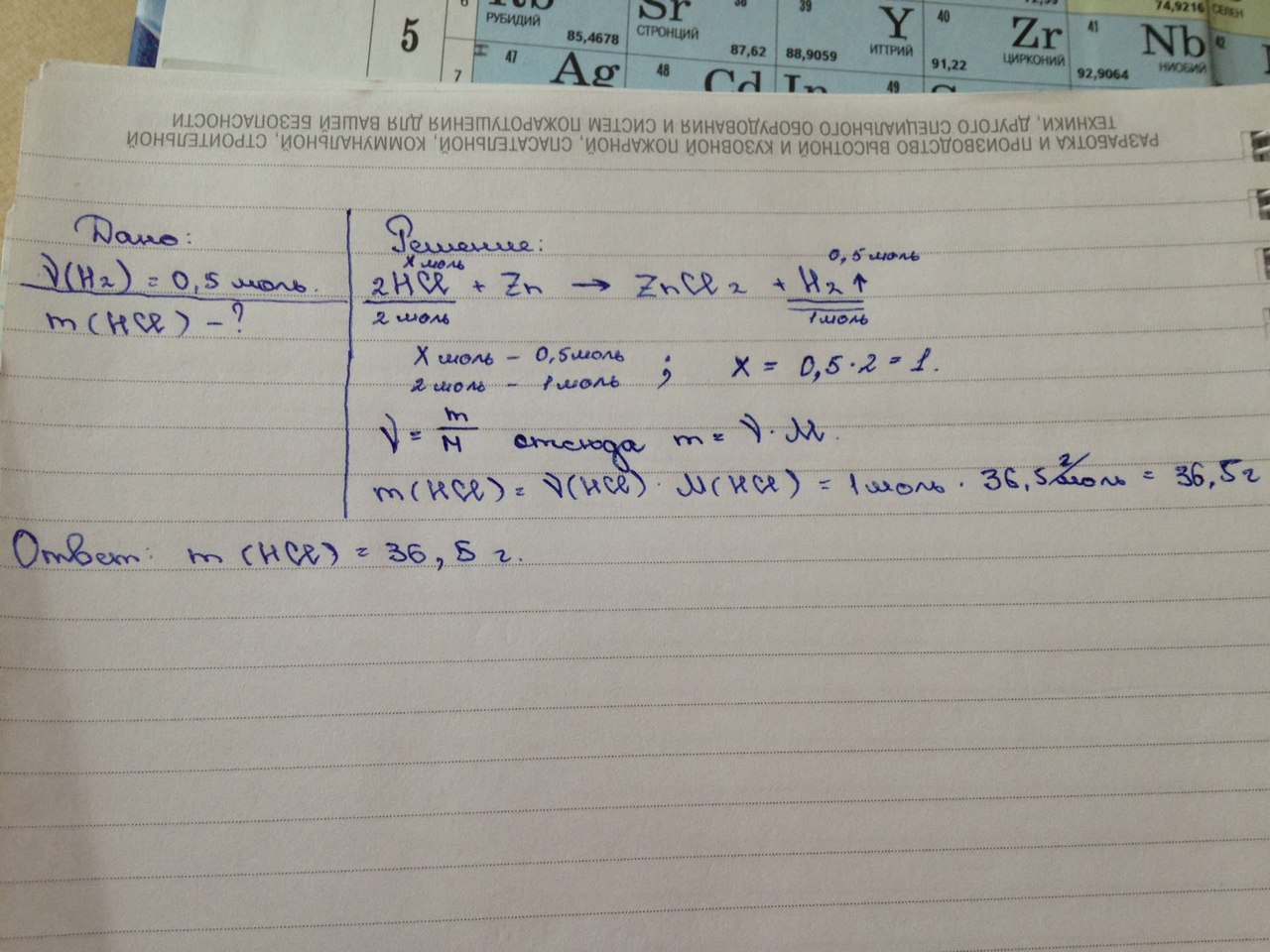 при взаимодействии Hcl с цинком выделился водород количеством 0,5 моль. вычислите массу Hcl Очень нужно подробное решение, помогите пожалуйста!)