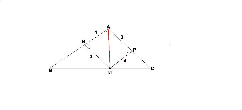 на гипотенузе ВС прямоугольного треугольника АВС взята точка М.Высота МР треугольника АМС=4,высота MN треугольника АМВ=3. найти АМ?