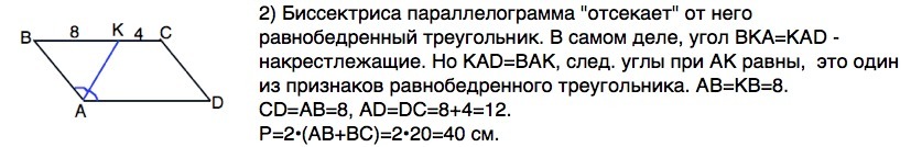2)Биссектриса угла А параллелограмма ABCD делит сторону BC на отрезки BK и KC , равные соответственно 8 см и 4 см.Найдите периметр параллелограмма.