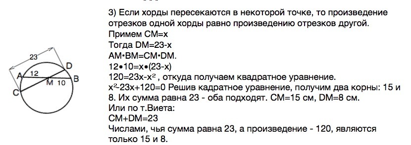 3)В окружности проведены две хорды AB и CD , пересекающиеся в точке M,MB=10 см ,AM=12 см,DC=23 см.Найдите длины CM и DM