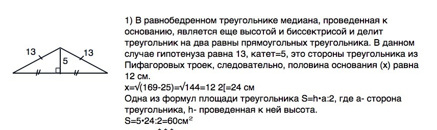 1) Боковая сторона равнобедренного треугольника равно 13 см ,а его медиана , проведенная к основанию, 5 см.Найдите площадь и периметр треугольника)
