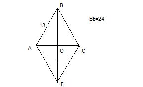 Т.к. диагонали ромба взаимно перпендикулярны, получаем прямоугольные треугольники АОВ, ВОС, СОЕ и АОЕ, которые равны между собой по гипотенузе (она равна 13) и катету (он равен 12).