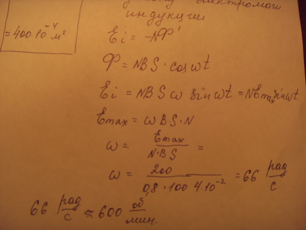 9. Индукция магнитного поля между полюсами двухполюсного генератора В=0,8Т. Ротор имеет N=100 витков площадью S=400см2. Сколько оборотов в минуту делает якорь, если максимальное значение э.д.с. индукции =200В? Ответ:600об/мин.