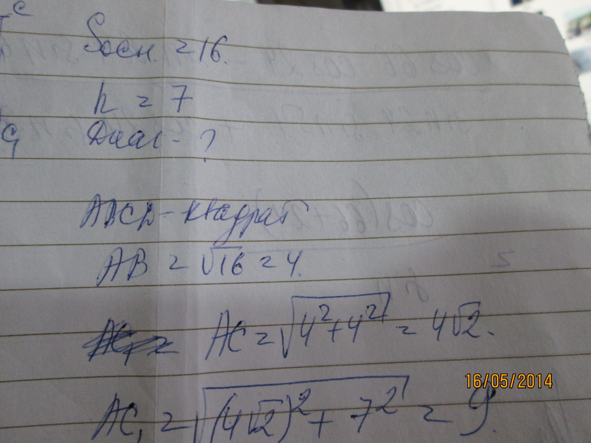 в правильной четырехугольной призме площадь основания равна 16 см2 .а высота 7см найдите диагональ призмы.