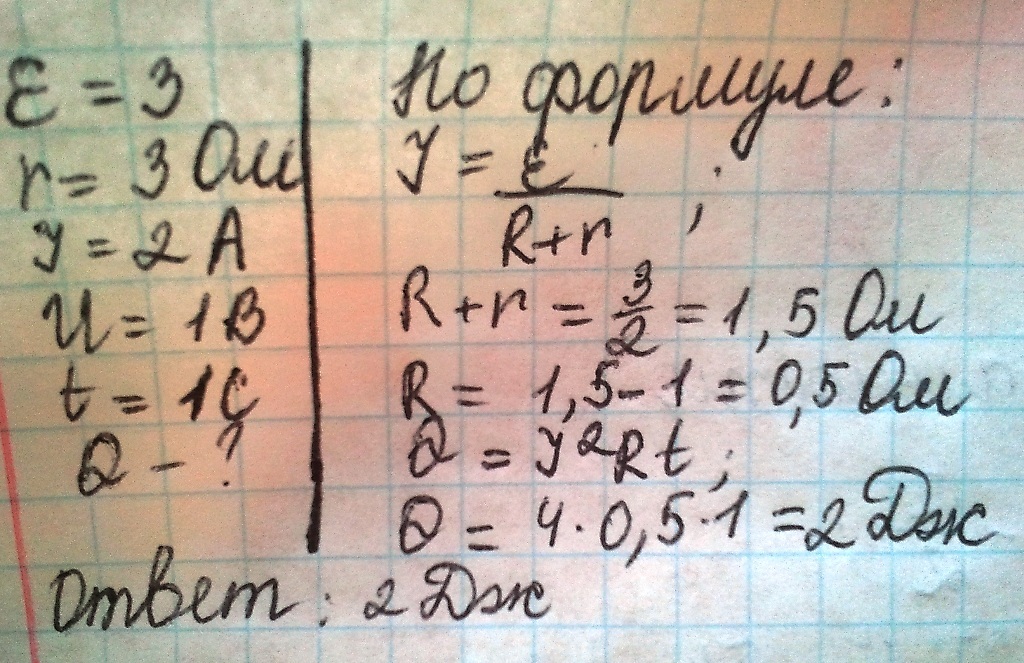 Вольтметр подключен к батарее с эдс 3 Внутреннее сопротивление 1 Ом ток 2 А. На вольтметре показывает 1 В. Какое количество теплоты выделится за 1 с
