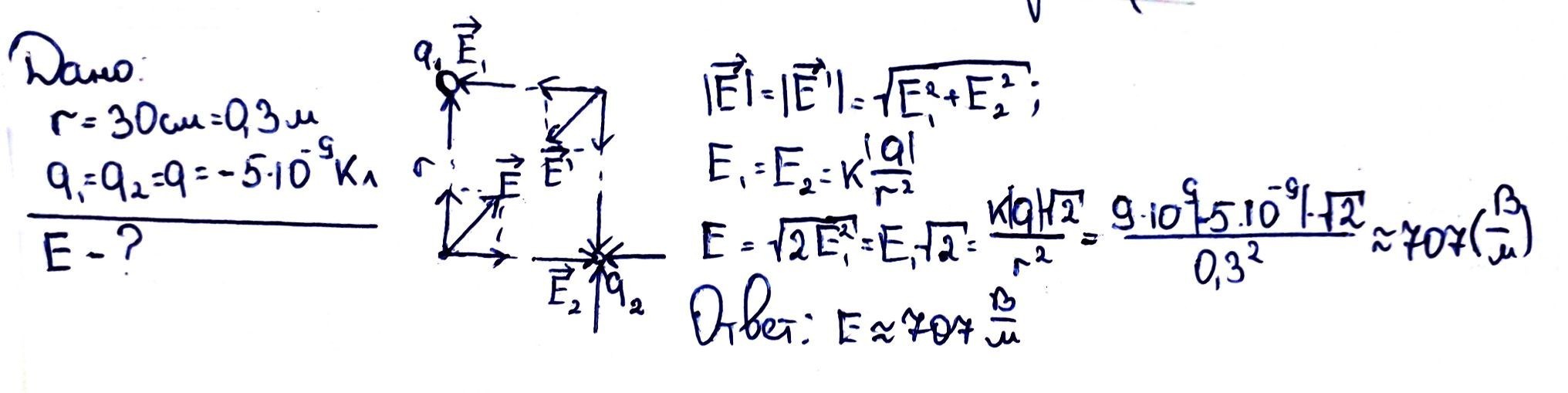 в двух противоположных вершинах квадрата со стороной 30 см находятся одинаковые отрицательные заряды по - 5 на 10 в - 9 каждый . найти напряженность поля в двух других вершинах квадрата