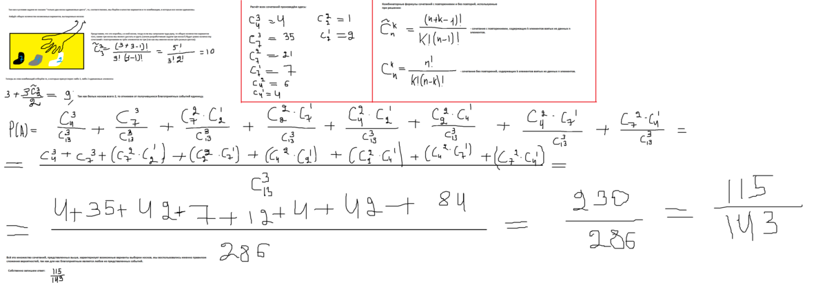 в ящике лежат 2 белых носка и4 серых носка и 7 черных носка. найдите вероятность того что из трех случайно выбранных носков хотя бы два окажутся одного цвета