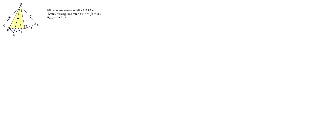 Все ребра треугольной MABC пирамиды равны 2 м. Найдите периметр сечения, проходящего через вершину M и середины сторон BC и AC основания. 1) 3 м. 2) 3√3 м. 3) (2+2√3) м. 4) (1+2√3) м.