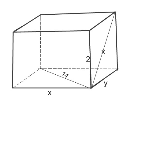 Диагональ меньшей боковой грани прямоугольного параллепипеда равна большему ребру основания. Высота параллепипеда равна 2 см. , диагональ основания равна 14см. Найти объём параллепипеда