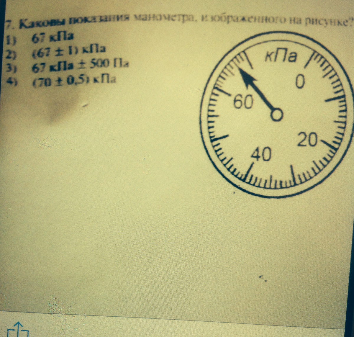 Между двумя большими делениями 10 кПА и 10 делений. Следовательно цена деления и погрешность изерения равны 1 кПа. Тогда верный ответ 2 (67+-1)кПА