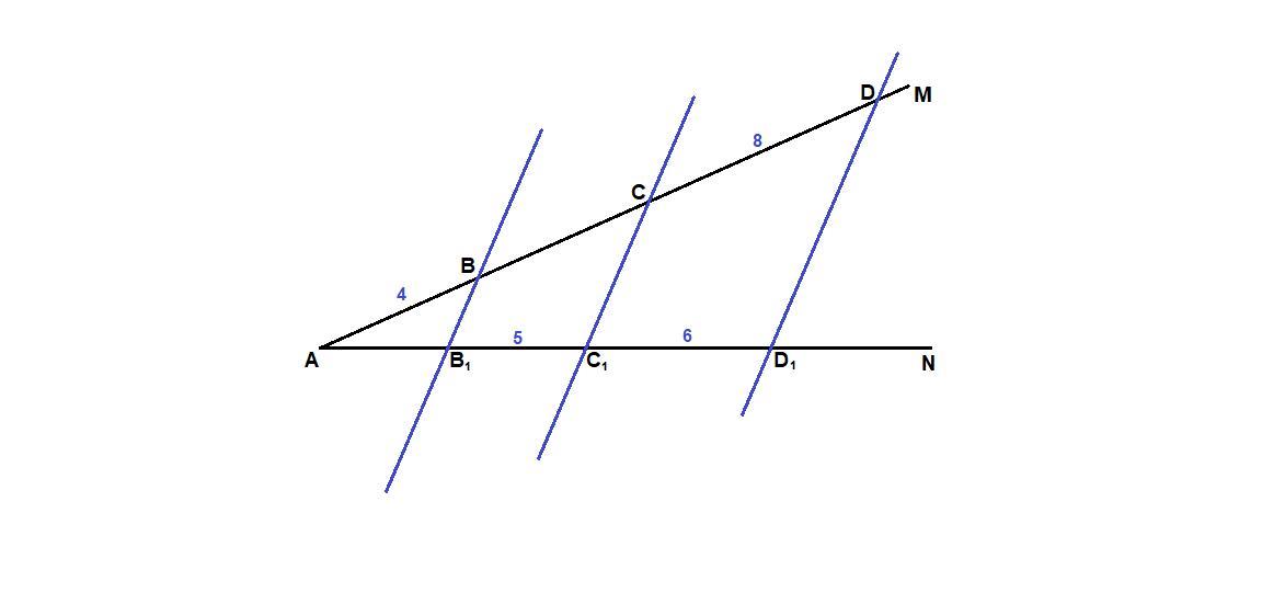 Параллельные прямые l,m и n пересекают стороны угла MAN.Найдите длины отрезков AB1и BD, если AB = 4см, CD = 8см, B1C1 = 5см, C1D1 = 6см.