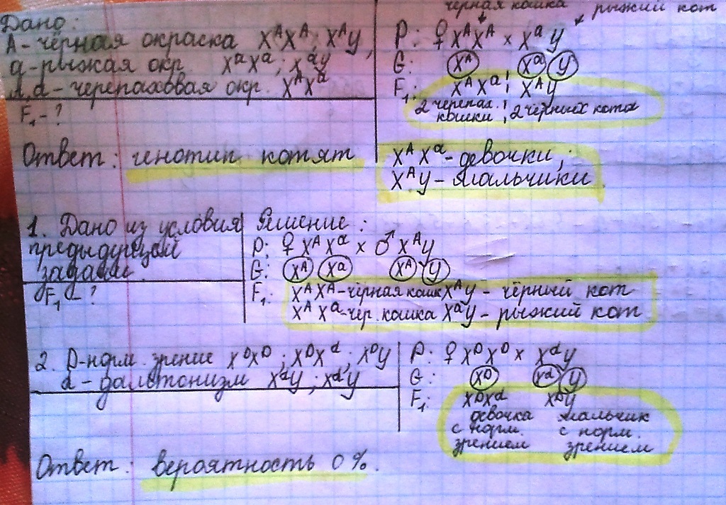 Черная кошка принесла котят, у двух из них черепаховая окраска шерсти у двух других – чёрная. Что можно сказать о генотипе котят и о том, каков их пол? 1. Какие котята получатся от скрещивания черепаховой кошки и чёрного кота? Определите их пол. 2.Рецессивный ген дальтонизма (цветовой слепоты) располагается в X – хромосоме. Девушка с нормальным зрением, родственники которой не страдали дальтонизмом, выходит замуж за мужчину дальтоника. Какова вероятность в этой семье появления мальчика (сына и внука) больного дальтонизмом?