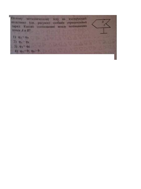 Полому металлическому телу на изолирующей подставке (см.рисунок) сообщён отрецательный заряд. КАКОВО СООТНОШЕНИЕ МЕЖДУ ПОТЕНЦИАЛАМИ ТОЧЕК А И В ?