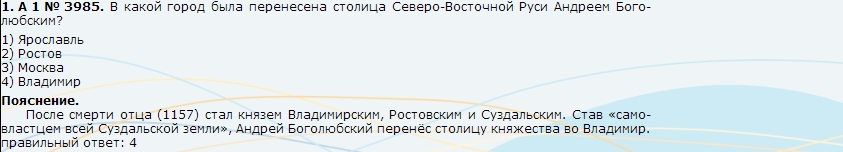 В какой из перечисленных городов была перенесена столица Северо-Восточной Руси князем Андреем Боголюбским? :1)Москва 2)Тверь 3)Владимир 4)Переяславль