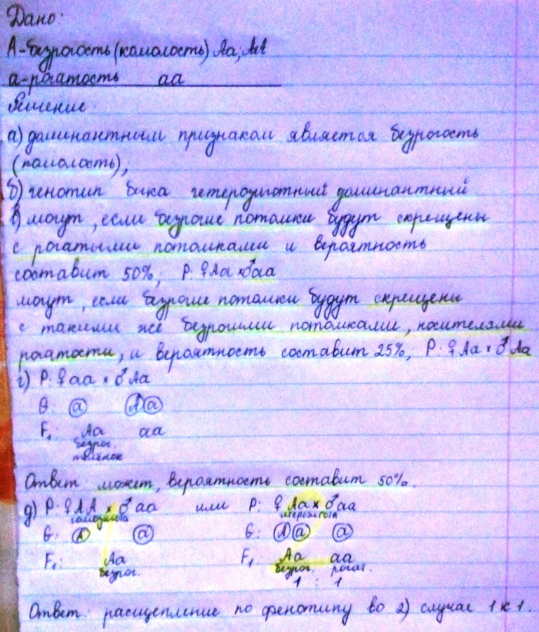 д) Какое может быть расщепление по фенотипу в потомстве от скрещивания безрогой коровы и рогатого быка?