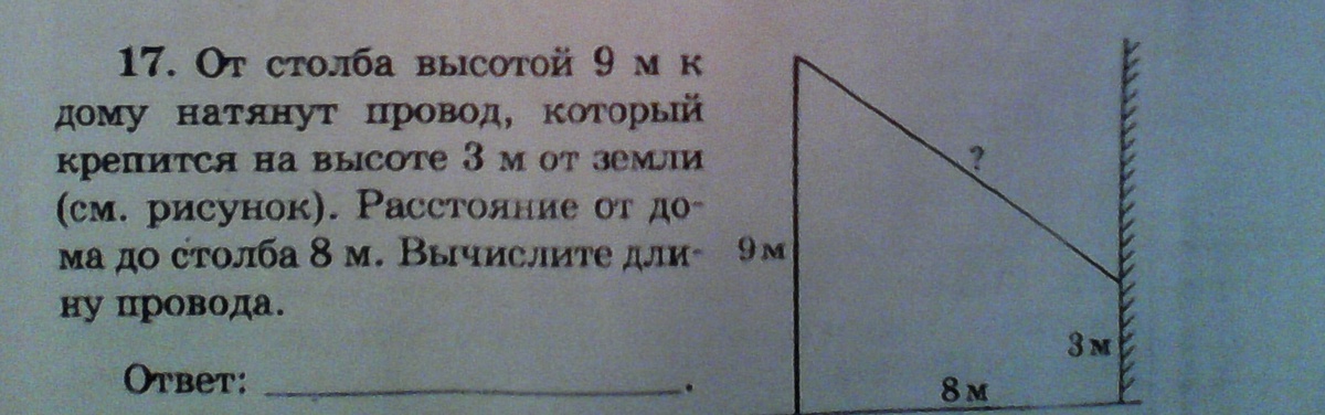 по теореме Пифагора находим длину провода : 6*6+8*8 = 100