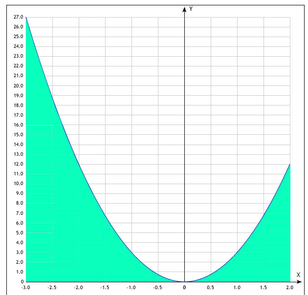 Фигура ограничена: сверху кривой у = 3х², снизу прямой у = 0, слева прямой х = -3, справа прямой х = 2 (см. также рисунок). Поэтому находим определённый интеграл от -3 до +2.