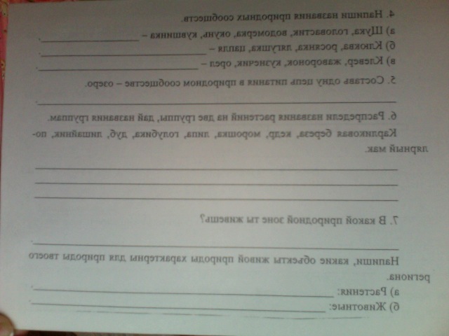 7) Природное сообщество - совокупность растений, животных, микроорганизмов, приспособленных к условиям жизни на определенной территории, влияющих друг на друга и на окружающую среду. Луг, болото, степь, пустыня, лес.