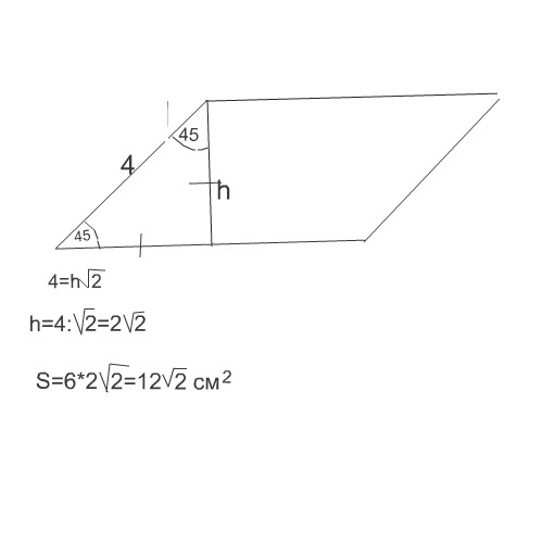 чему равна площа паралелограма стороны которого равны 4 см и 6 см ,а угол между ними - 45 градусов
