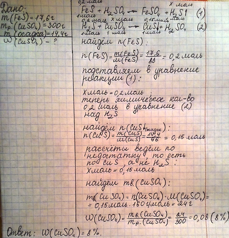 Газ, полученный при взаимодействии сульфида железа (II) массой 17,6 г с избытком серной кислоты, пропустили через раствор сульфата меди (II) массой 300 г. Образовался осадок массой 14,4 г. Определите массовую долю сульфата меди (/II) в растворе. Ответ: 8%
