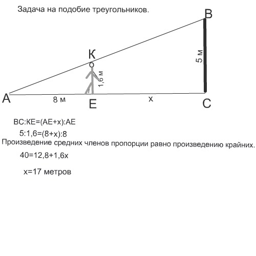 На каком расстоянии (в метрах) от фонаря стоит человек ростом 1,6 м,если длина его тени равна 8м,высота фонаря 5м