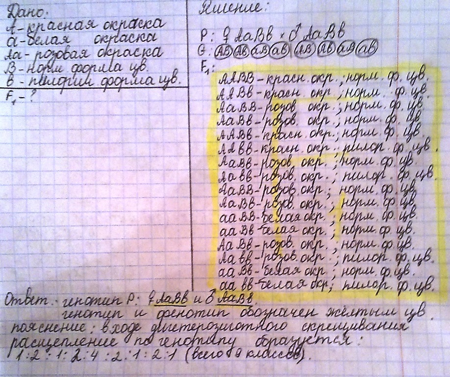 У львиного зева красная окраска цветка не полностью доминирует над белой. Нормальная форма цветка полностью доминирует пилорической. Какое потомство получится от скрещивания двух дигетерозиготных растений? Определите генотипы родителей, генотипы и фенотипы потомков. Составьте схему решения задачи, обоснуйте результаты скрещивания.