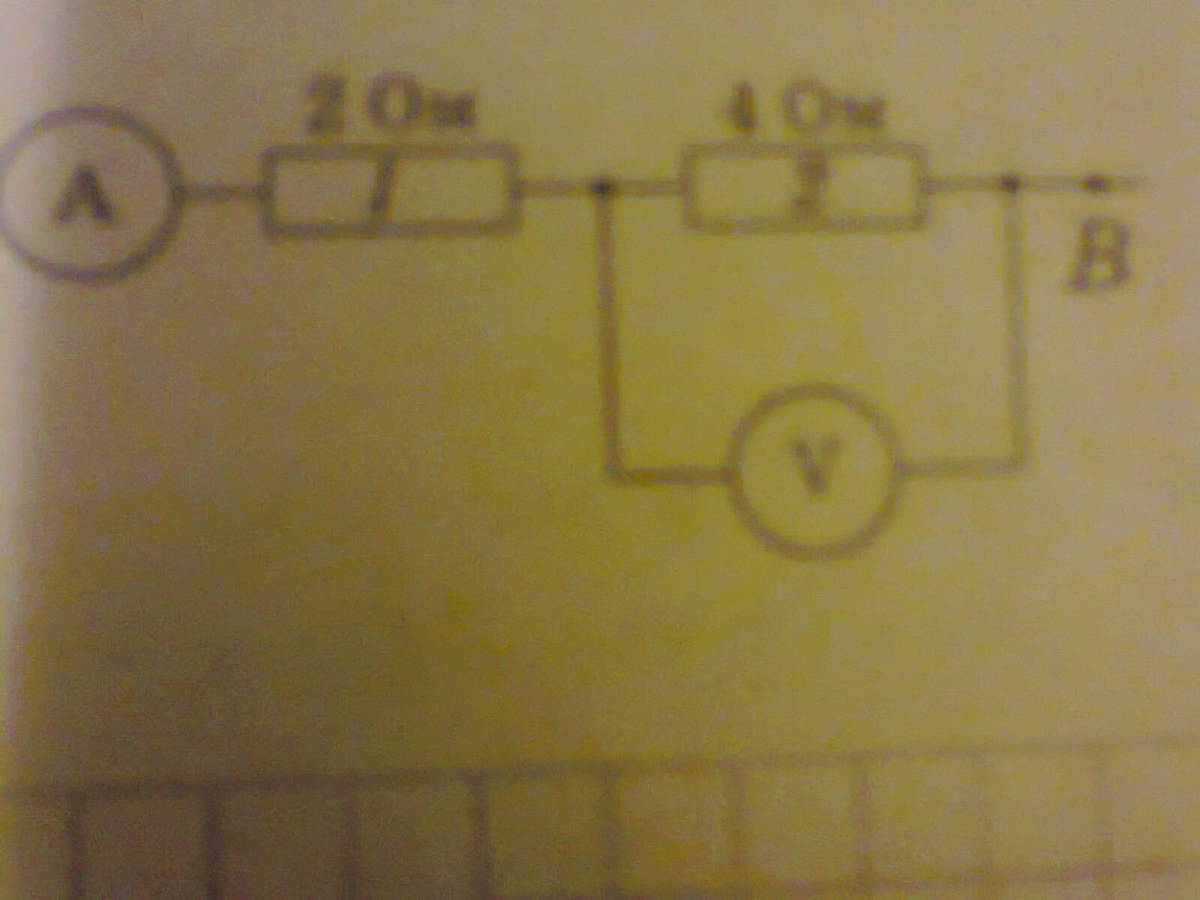 воспользовавшись даными с ресунка, определите силу тока, которую покажет амперметр, и напрежение на участке ав, если показание вольтметра составляет 1,2в