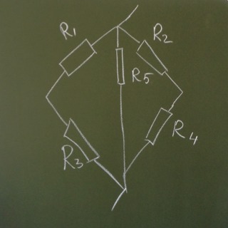 Определить общее сопротивление цепи между точками, если R1=2Om;R2=5Om;R3=20Om;R4=5Om;R5=10Om.