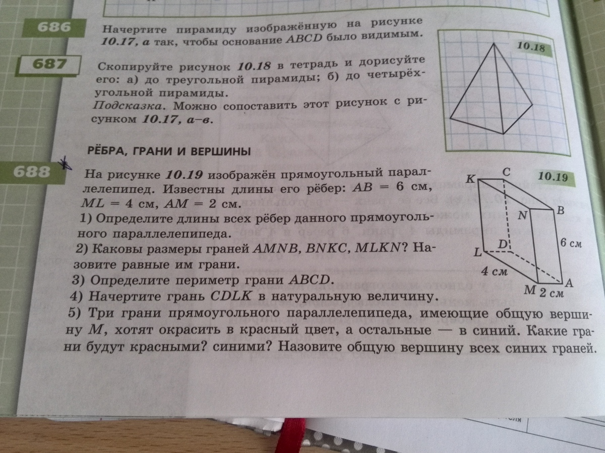 1)AB NM KL CD=6см LM DA KN CB=4(см) AM LD KC NB=2(см) 2) Площадь BNKC=2*4=8cм2 ANMB=2*6=12 см2 MNKL=4*6=24 cм2 3)Периметр грани АВСD=(6+4)*2=20 см 4)Красными будут грани:ADLM MNKL ABNM , Синими: BNKC ABCD LDCK c вершиной С.