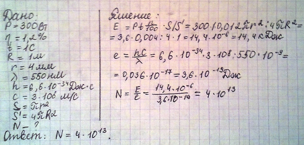 Электрическая лампа мощностью 300 Вт излучает 1,2 % потребляе¬мой энергии в виде света равномерно по всем направлениям. Сколько фотонов видимого света попадает за 1 с в зрачок человека, находящегося на расстоянии 1 м от лампы? Диаметр зрачка 4 мм, средняя длина волны 550 нм. Прошу полный ход решения