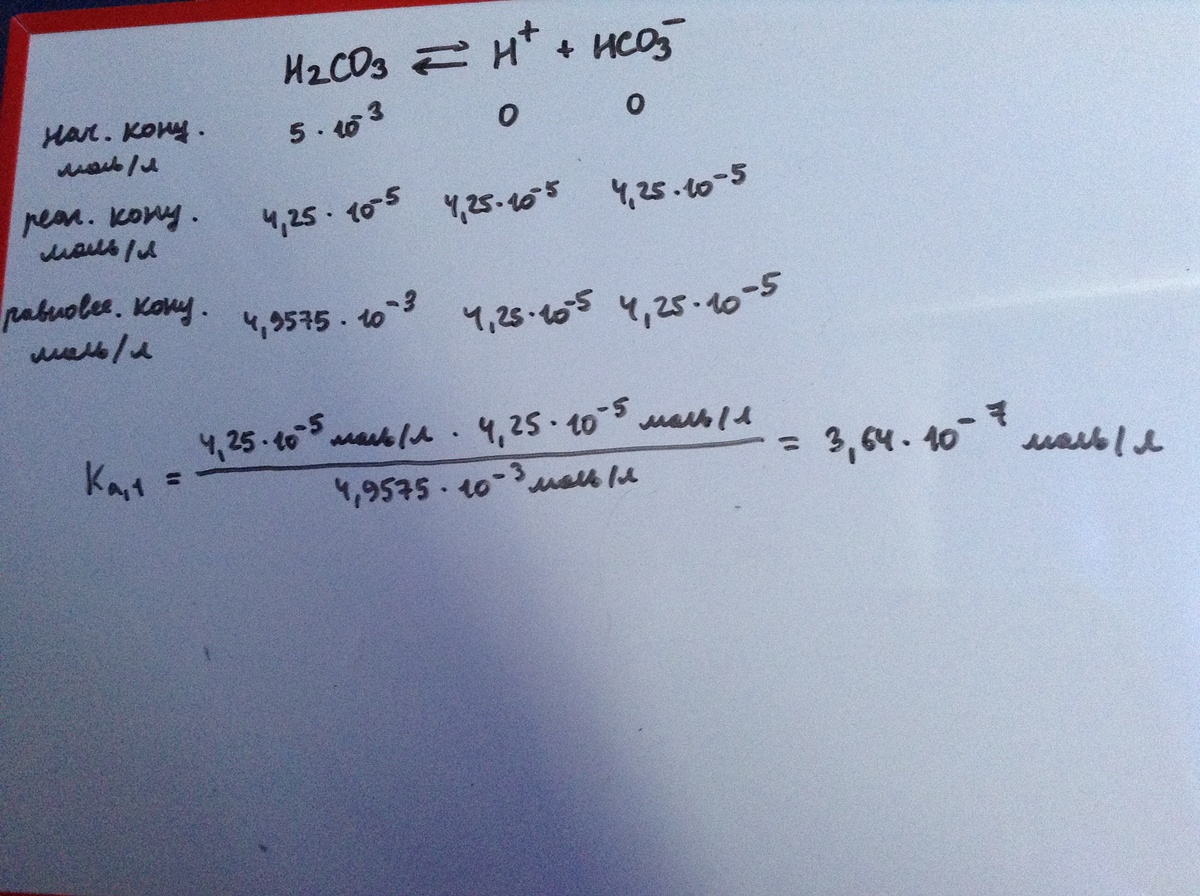 угольная кислота диссоциирует по первой ступени.Концентрация ионов водорода в 0,005 М растворе равна 4,25*10^(-5) моль/л. Определить константу диссоциации H2CO3 по первой ступени.