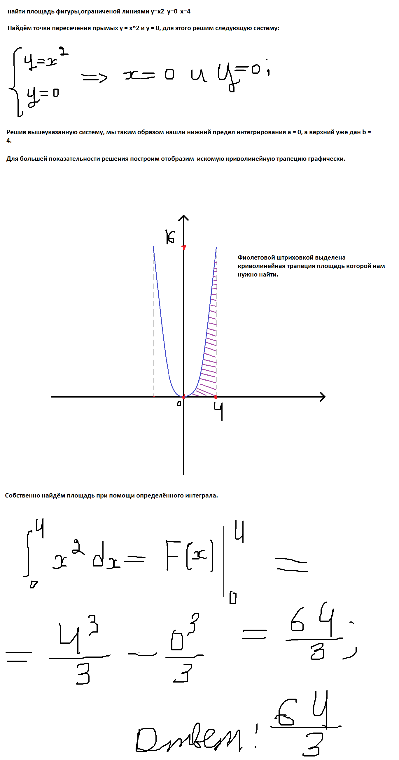 S= интеграл от 0 до 4(х^2)dx=(x^3)/3=4^3/3=64/3 ед.кв.
