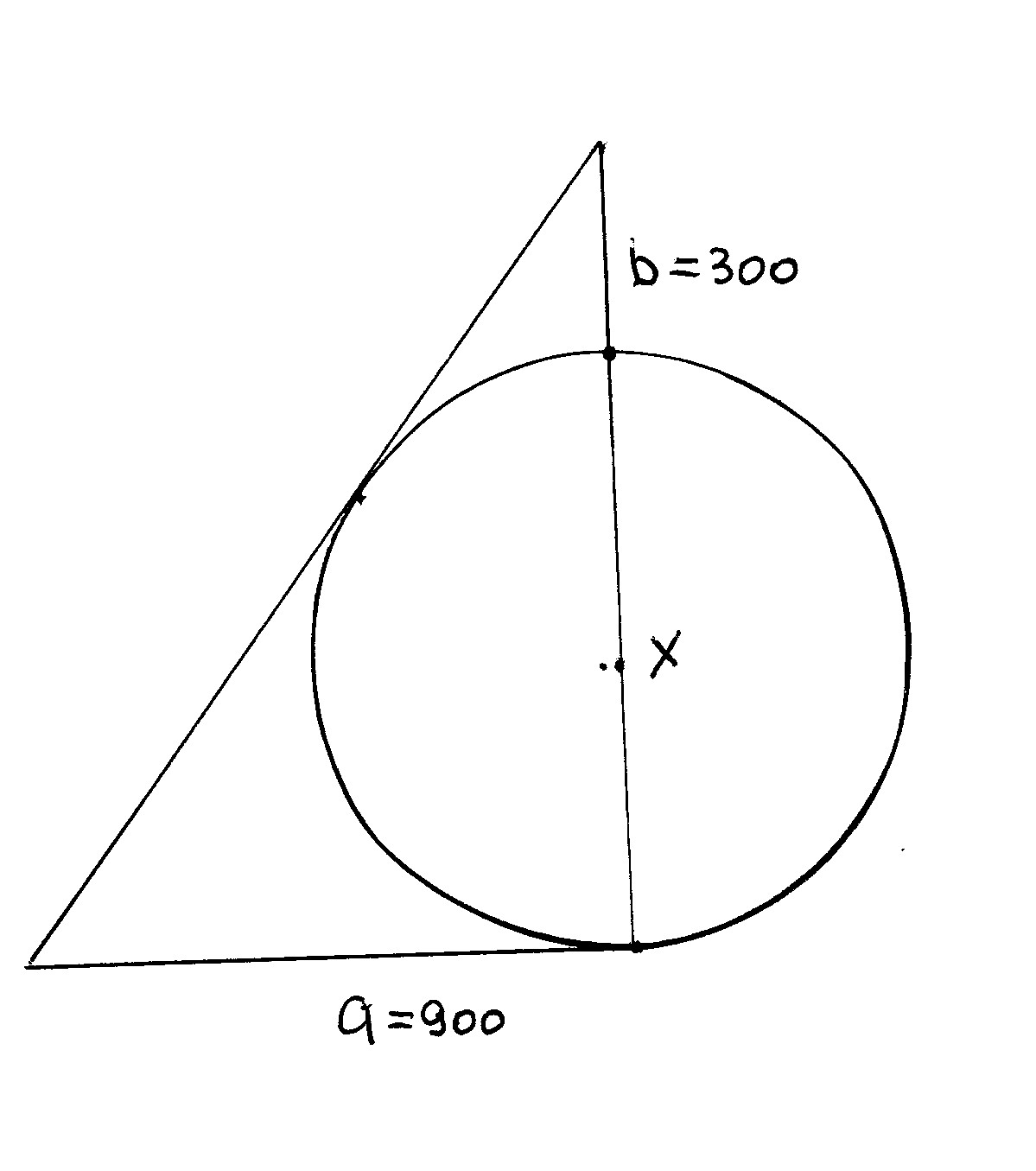 1). Берем квадрат и на одной из сторон как на диаметре, построим полуокружность. Из вершины противоположной стороны проведем касательную, и продолжим её до пересечения с продолжением стороны. Очень просто показать, что все условия задачи (t = 1/3) выполнены (раз уж вы просили без, вычислений я опять не привожу, но сразу говорю - они не выходят за рамки теоремы Пифагора). Таким образом, мы показали, что поперечник города равен 900. (ну, понятно же, если еще не сообразили - от северных ворот на юг откладываем 900, проводим перпендикуляр, точку соединяем с "точкой видимости", и получаем "еще одно дерево", и "еще одину окружность". Но дерево только одно, поэтому полученная точка совпадает с южными воротами).