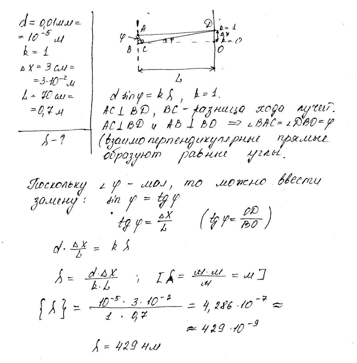 На диффракционную решетку с постоянной 0.01мм напрвлена монохроматическая волна. Первый дифракционный max получен на экране смещенным на 3 см от первоачального напраления света. Определите длину волны монохроматичесского излучения, если расстояние между экраном и решеткой 70 см.