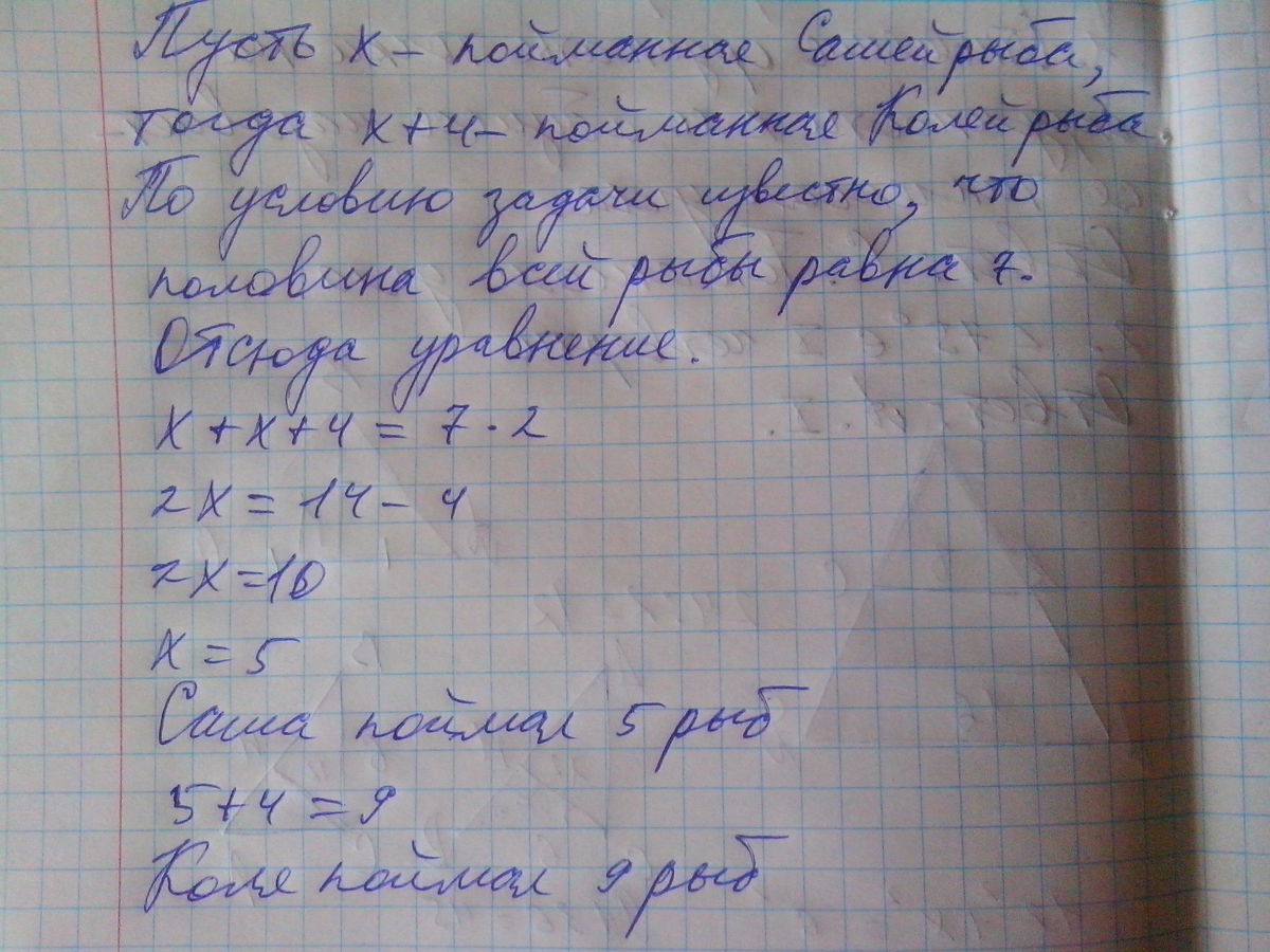 Коля и Саша ловили рыбу. Коля поймал на 4 рыбы больше чем Саша. Когда они поделили рыб поровну, то каждому досталось по 7 рыбок. Сколько рыбок поймал каждый? Нужно оформление решения!!!!!!!!!