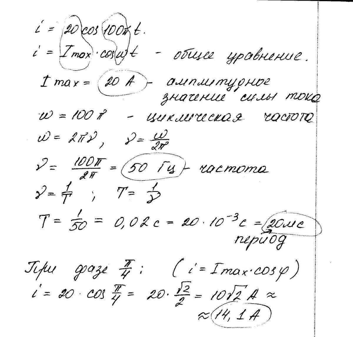 изменение силы тока задано уравнением i=20 cos 100п(пи) t. Найти частоту, период колебания, амплитуду силы тока и значение силы тока при фазе п/4.