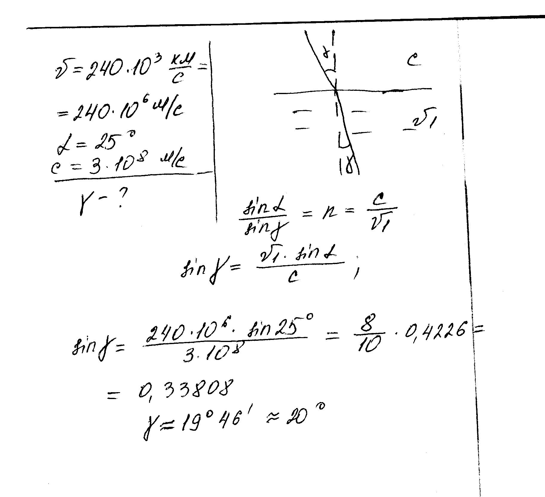 Скорость распространения света в некоторой жидкости равна 240*10^3 км/с.На поверхность этой жидкости под углом 25 градусов из воздуха падает луч.Определить угол преломления луча.