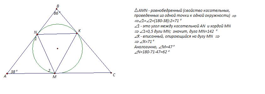 в треугольнике ABC углы A и B равны 38 и 86 соответственно. найдите углы треугольника, вершинами которого являются точкикасания сторон с вписаной в ABC окружностью.