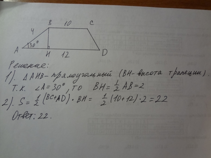 вычислите площадь трапеции основания которой равны 10 и 12 см а одна из боковых сторон равна 4 см и образует с основанием угол в 30 градусов